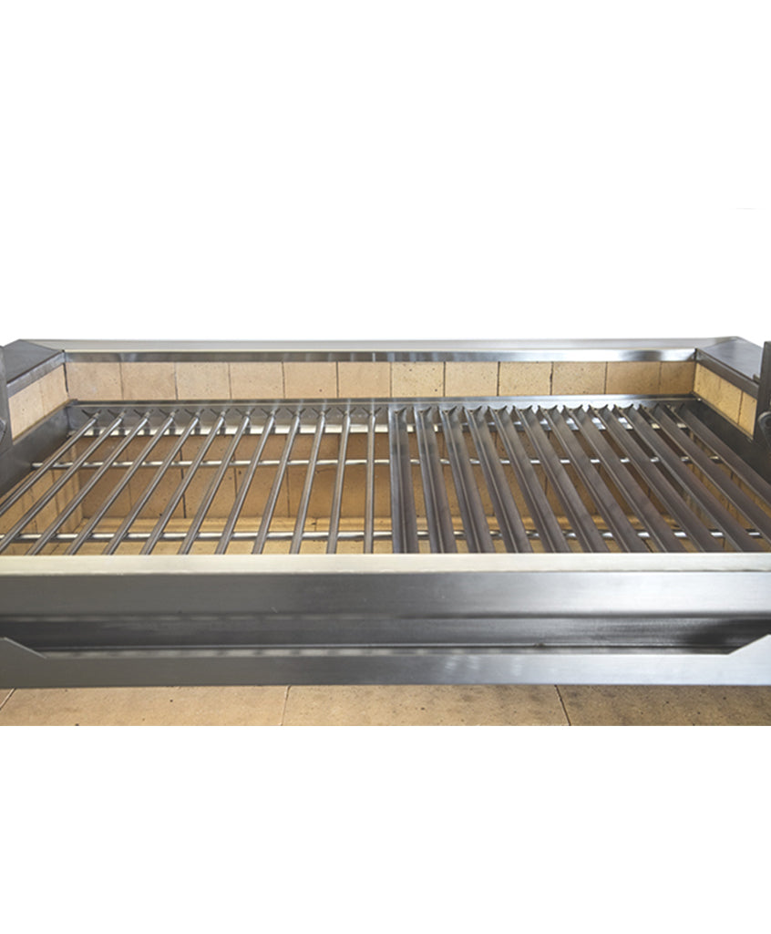 Nuestra parrilla integra en acero inoxidable desmontable y de fácil limpieza cuenta con tapa frontal y doble juego de varillas desmontables (tubular y en V), un recipiente para jugos, 3 ganchos para colgar y asar alimentos con facilidad, sistema de elevación en forma de cruz de malta que evita que la rejilla caiga asegurando buena estabilidad, base con ladrillos refractarios en zona de combustión para tener una mayor eficiencia calórica y una repisa inferior para mantener leña, carbón y utensilios parrilleros