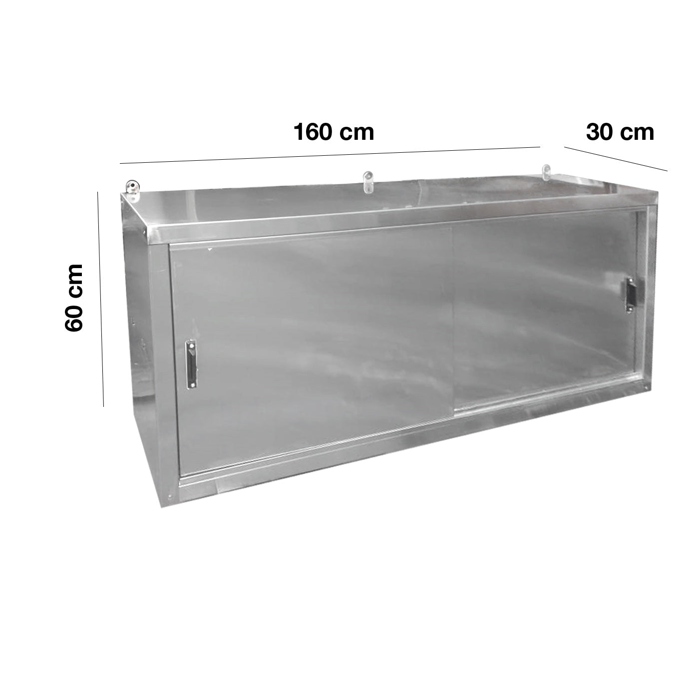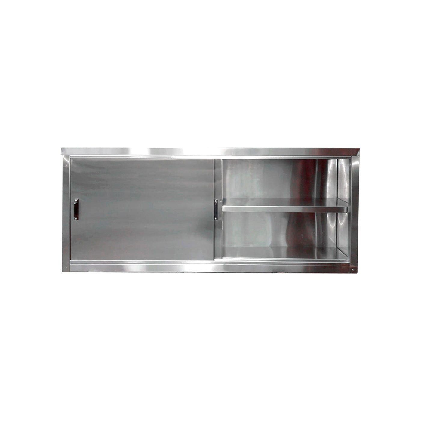 Disponible en varias medidas y compatible con nuestros mesones de trabajo y repisas aéreas en acero inoxidable. Cuenta con una repisa intermedia y dos puertas correderas