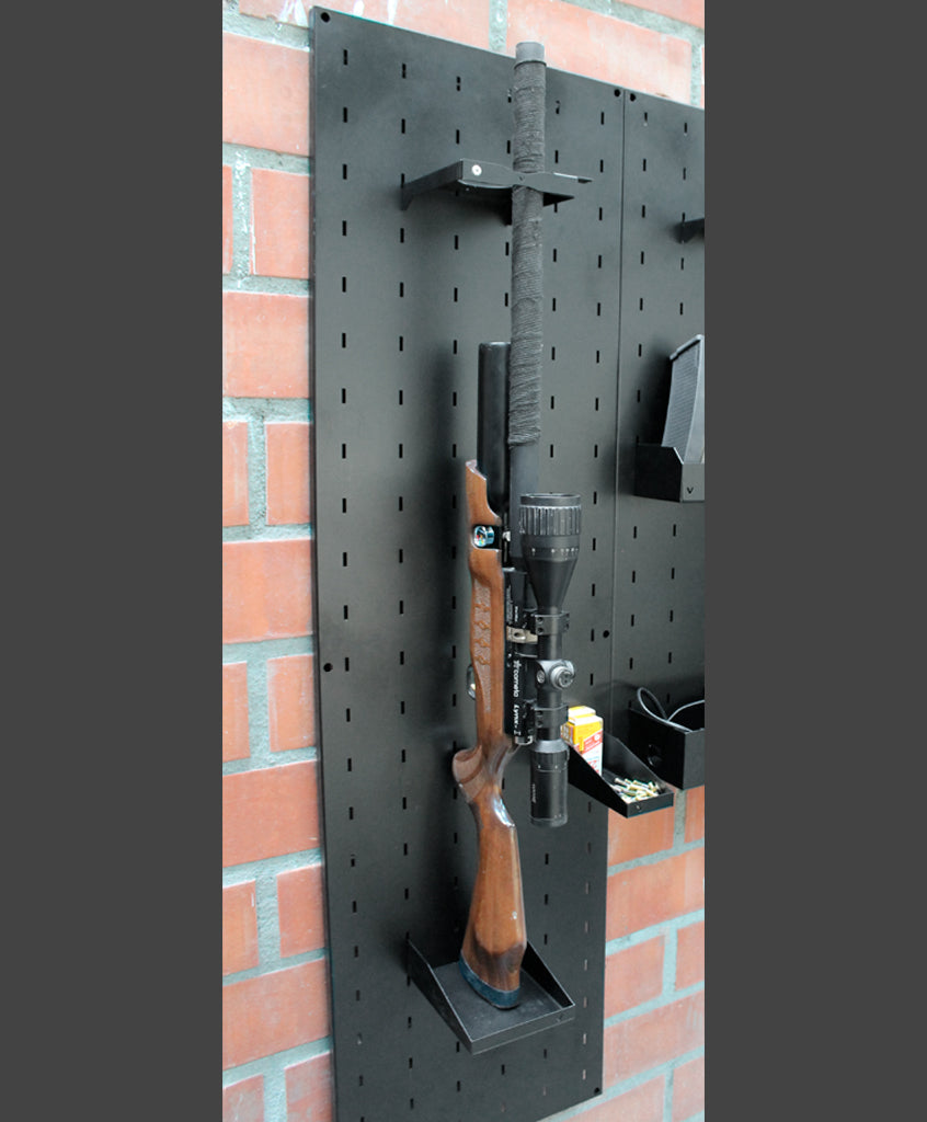 Este accesorio nos encanta , sirve para guardar armas y herramientas verticales , consta de dos parte , una repisa que tiene bastante espacio para culatas , cañas , chuzos ,palas, tutores ...etc , y otra parte la cual tiene un seguro así aseguramos que no se caiga la herramienta.