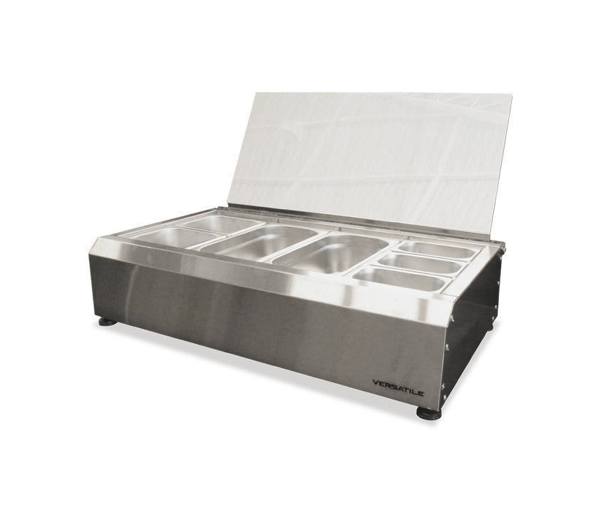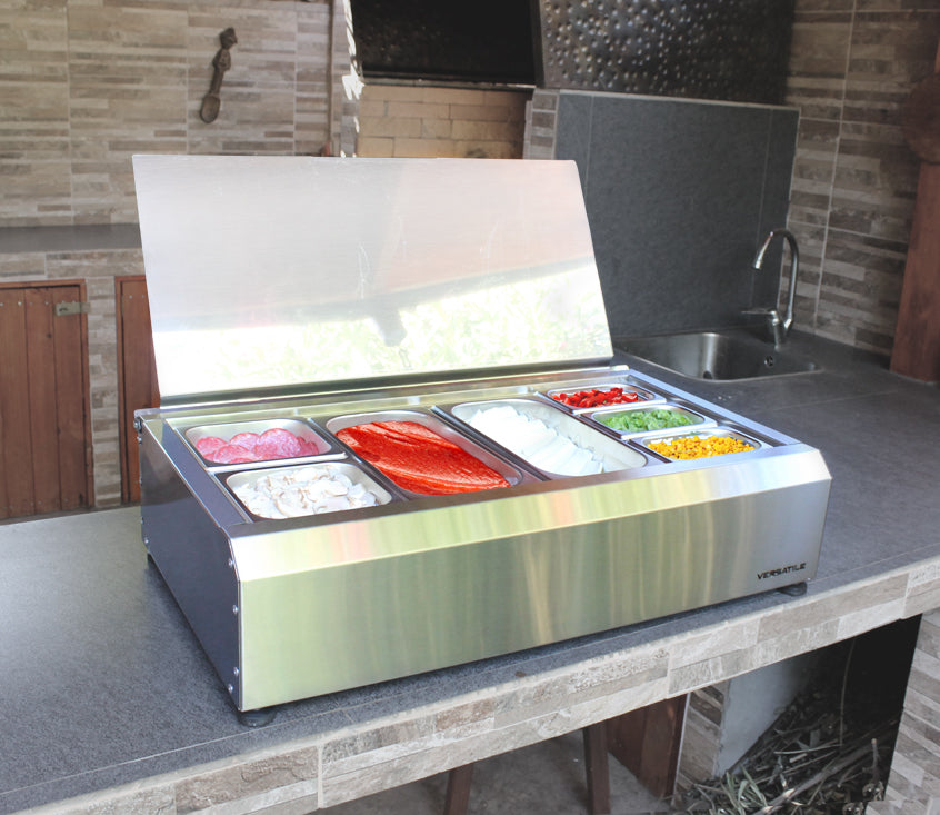 Incluye 7 GN en acero inoxidable de diferentes tamaños para adaptarse a tus necesidades Si lo deseas puedes incorporar una bandeja de frio para dar mayor frescura a los alimentos. (no incluida) Este equipo no es eléctrico.