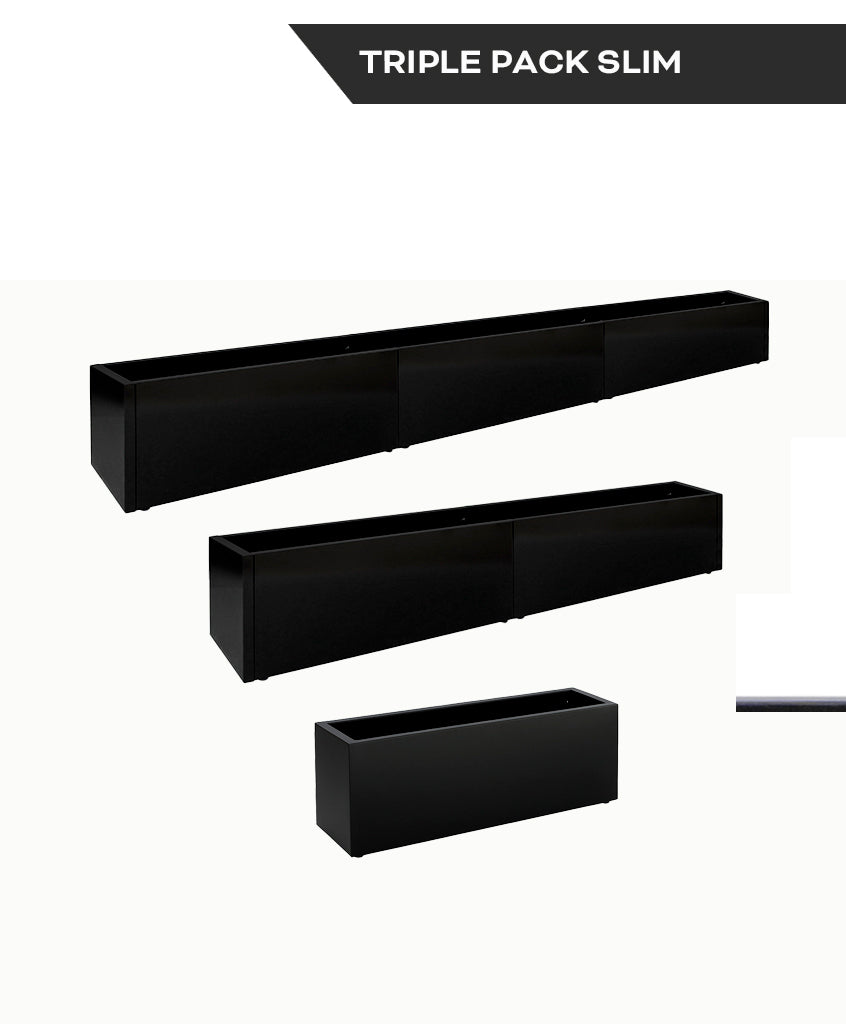 Este triple pack ofrece la combinación de jardineras SLIM en ancho de tres tamaños , todos bajo la misma altura, dando realce de acuerdo a como las dispongas y las plantas que selecciones para destacar.
